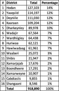 Degmada Hodan waxaa iska diiwaan geliyay 127 kun ruux Sidoo kale Degmada Yaaqshiid oo ku xigta waxaa iska diiwaan geliyay 114 kun ,Dayniile oo 3-aad ku jirta waxaa iska diiwaan geliyay 111 kun halka Kaaraan ay iska diiwaan geliyeen 109 kun ruux, sidaas waxay ku noqonayaan 4-ta  ee dadka ugu badan ay iska diiwaan geliyeen.