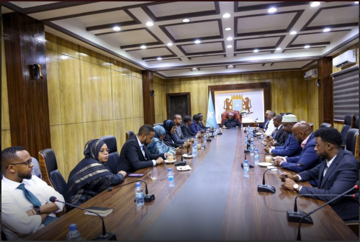 MUQDISHO (SMN) – Guddoomiyaha Golaha Shacabka ee Baarlamaanka Jamhuuriyadda Federaalka Soomaaliya Mudane Sheekh Aadan Maxamed Nuur (Madoobe) ayaa xafiiskiisa kulan kula qaatay Guddiga Madaxa Banaan ee Doorashooyinka Qaranka iyo Soohdimaha, waxaanna Guddoomiyaha Guddiga Cabdikariin Axmed Xasan uu Guddoomiyaha Golaha Shacabka u faahfaahiyay shaqooyinka guddiga gaar ahaan waxyaabihii u qabsoomay tan iyo markii la magacaabay iyo sidoo kale qorshayaasha u degsan.