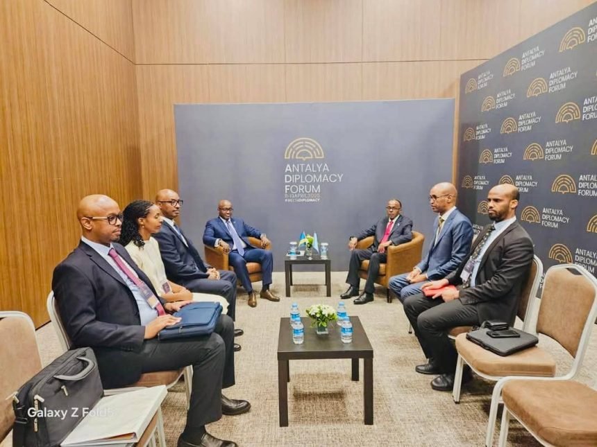 The State Minister for Foreign Affairs and International Cooperation, H.E. Ali Mohamed Omar, held a meeting on Friday with the Minister of Foreign Affairs and International Cooperation of the Republic of Rwanda, H.E. Amb. Olivier Jean Patrick Nduhungirehe, on the sidelines of the 4th Antalya Diplomacy Forum (ADF2025), which commenced today under the auspices of Turkish President Recep Tayyip Erdoğan and hosted by the Türkiye Ministry of Foreign Affairs.